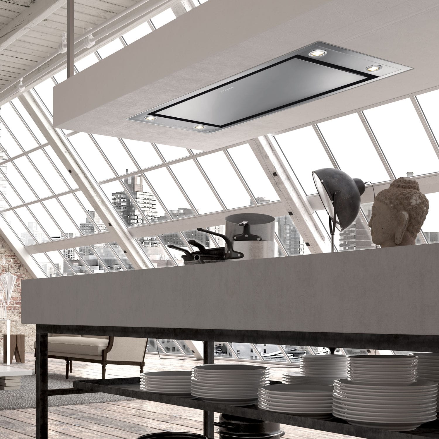 Le nostre cappe a soffitto e a isola ripuliscono l'aria creando una piacevole atmosfera.